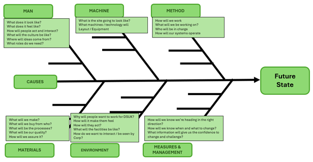 Considering each element of the fish bone (Man, Machine, Methods, Materials, Measures and Environment) provided detail and understanding of the different facets involved, how they interfaced and the effect the interactions would have on each other.